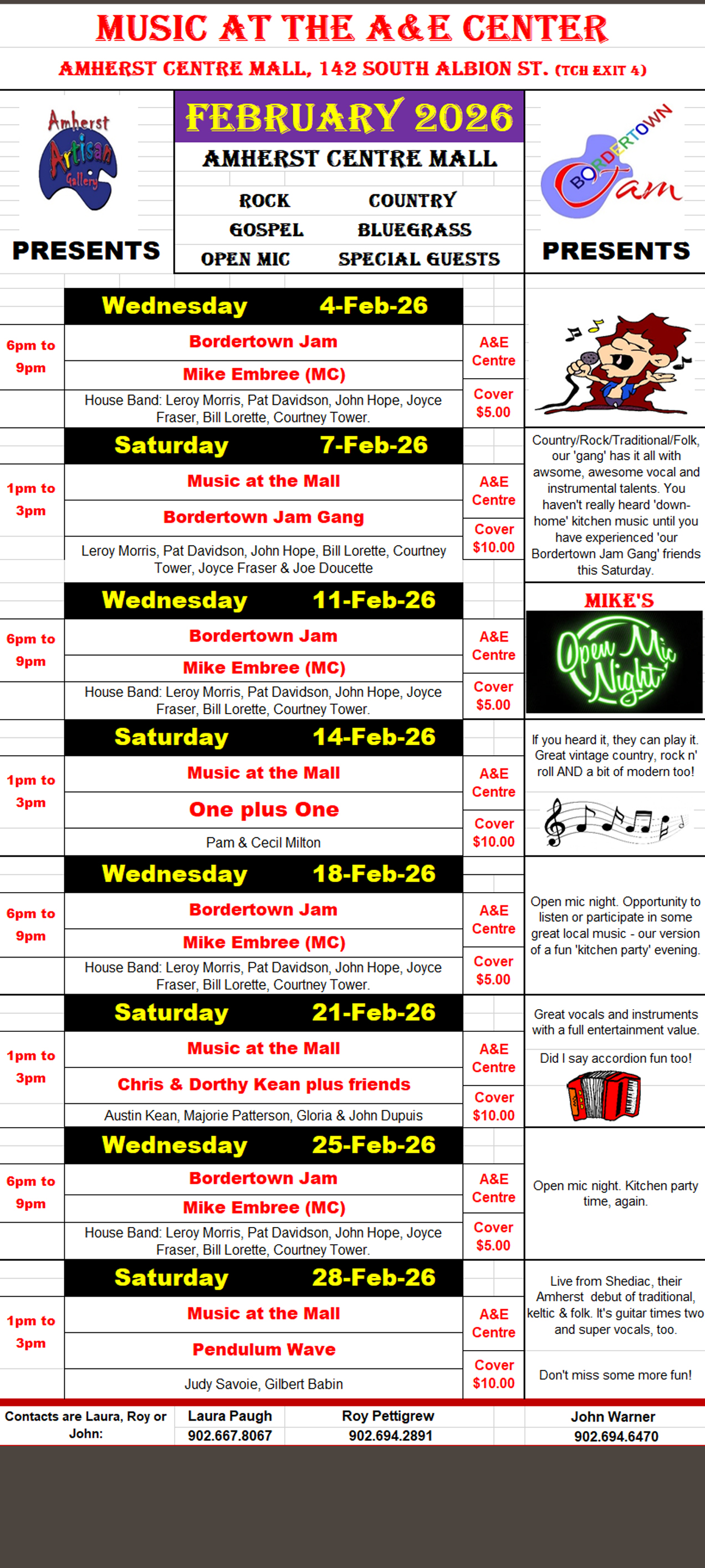 Join us for weekly music at the A&E centre. A small cover charge may apply.