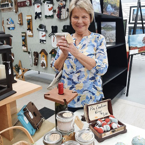 Rodney makes a wonderful variety of things out of wood. From colourful lawn flowers representing your favourite team, to whimsical bird feeders. There is always something unique in Rodney’s area of the gallery.